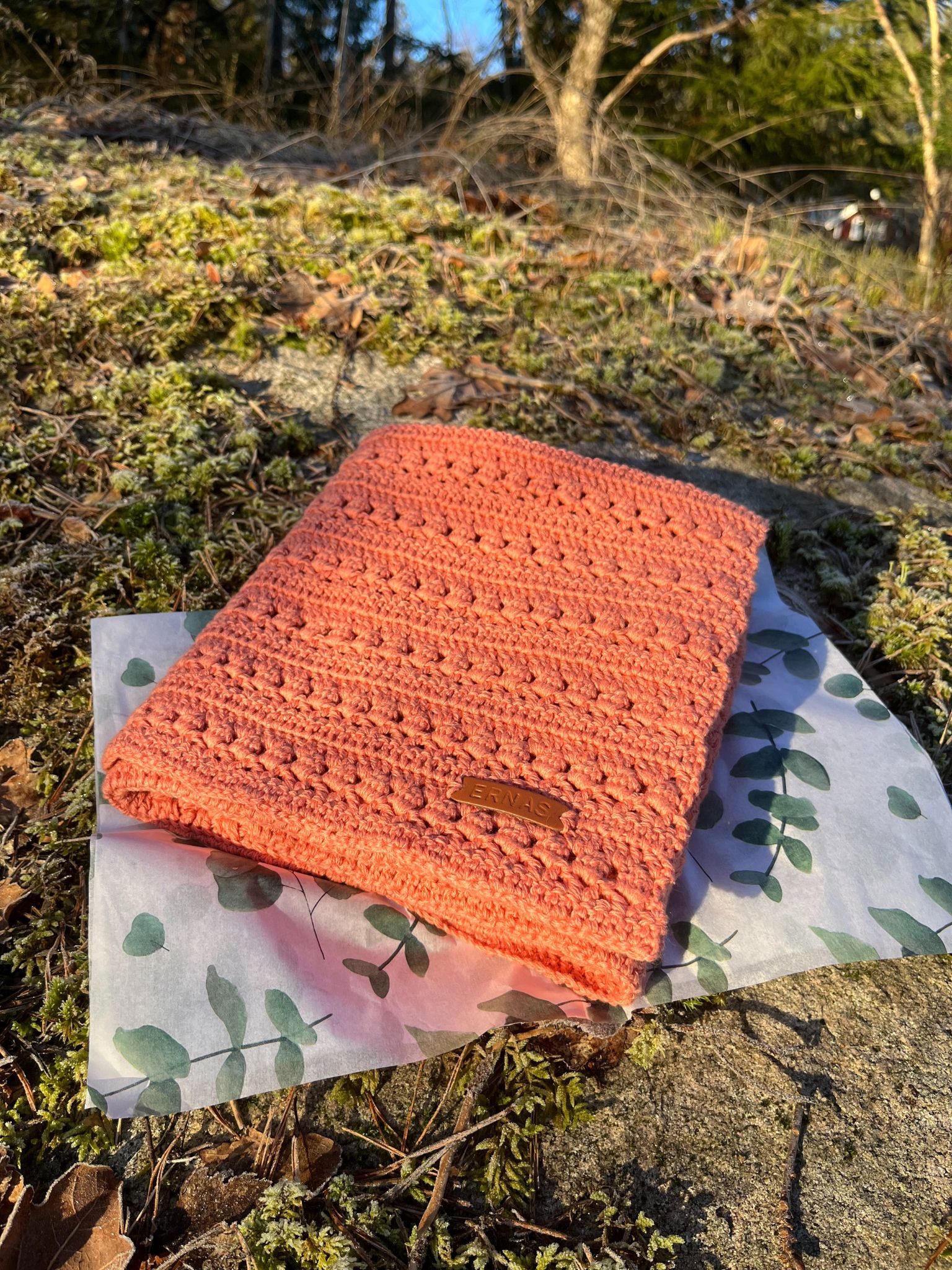 Ett harmoniskt set med handgjord babyfilt och matchande napphållare, skapat i liten skala med omtanke om både form och funktion.